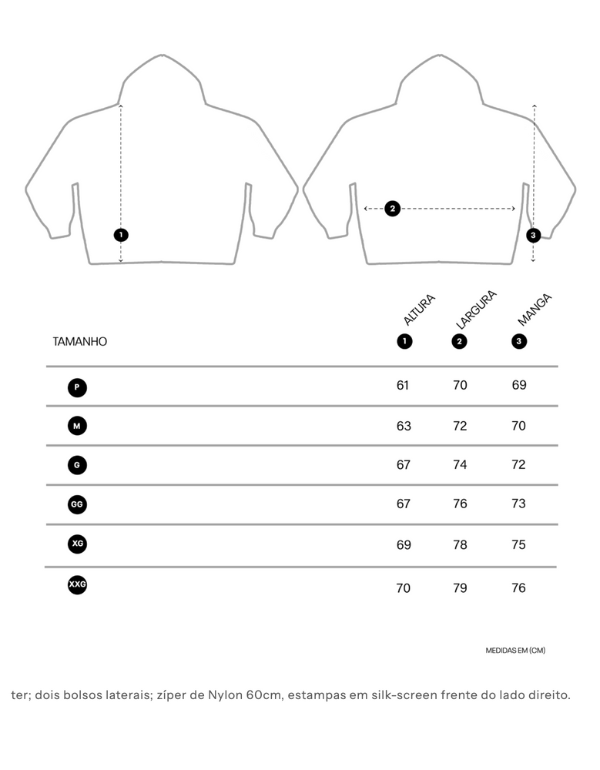 BLUSA MOLETOM CONFECCIONADA EM MALHA 50% ALGODÃO 50% POLIÉSTER; DOIS BOLSOS LATERAIS; ZÍPER DE NYLON 60CM, ESTAMPAS EM SILK-SCREEN FRENTE DO LADO DIREITO.